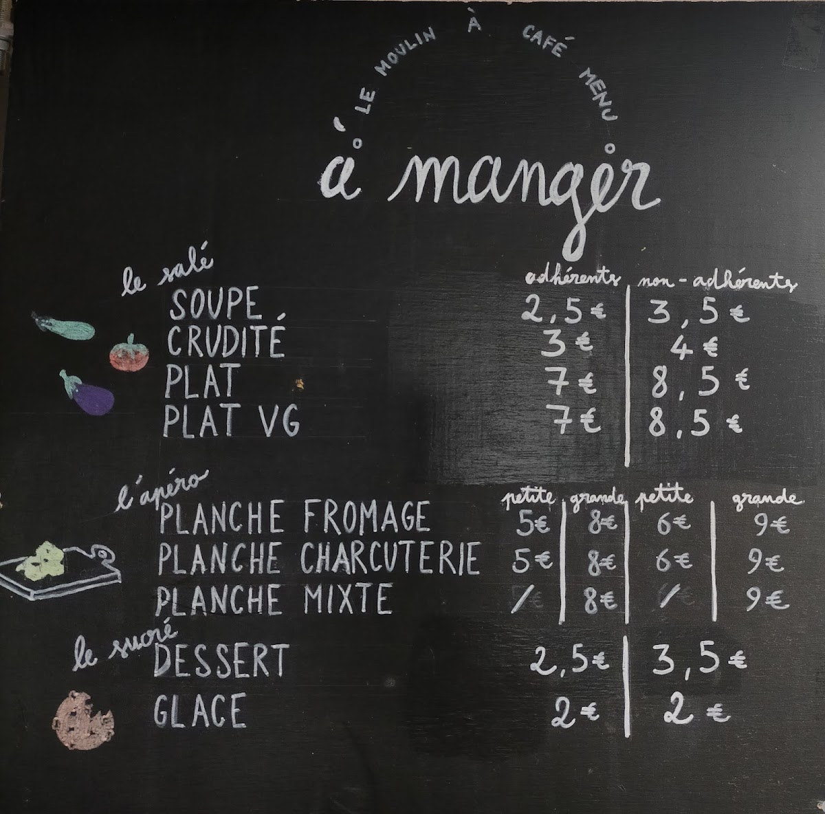 The café features a menu that emphasizes affordability without sacrificing quality. For just €3.00, you can savor the Entrée Crudités Du Jour, a refreshing starter that highlights the freshness of seasonal vegetables. If you're in the mood for something warming, the Soupe Du Jour at €2.50 is a comforting choice, showcasing the classic French tradition of soup-making. The heart of Le Moulin à Café lies in its daily offerings, like the Plat Du Jour (€7.00) and the Plat VG Du Jour (€7.00), which provide hearty, home-cooked meals perfect for a lunch break.